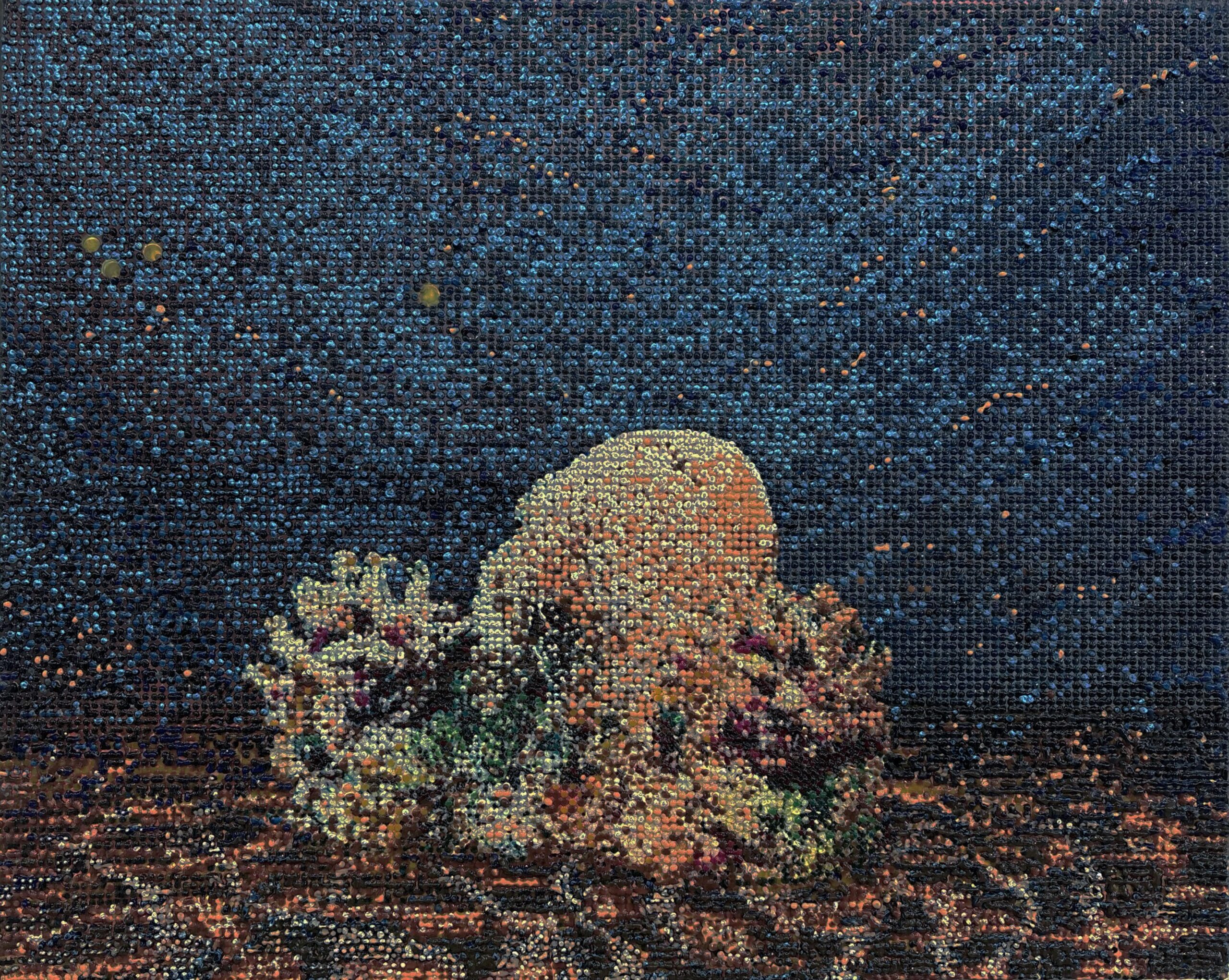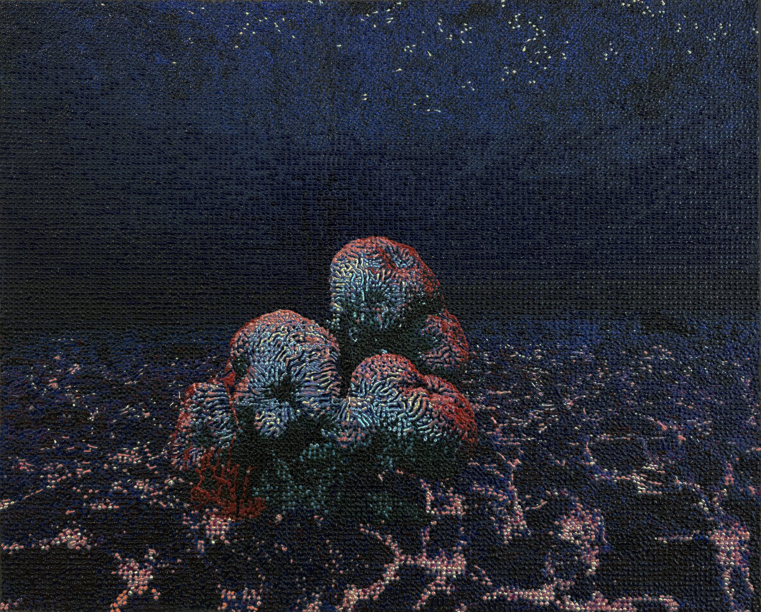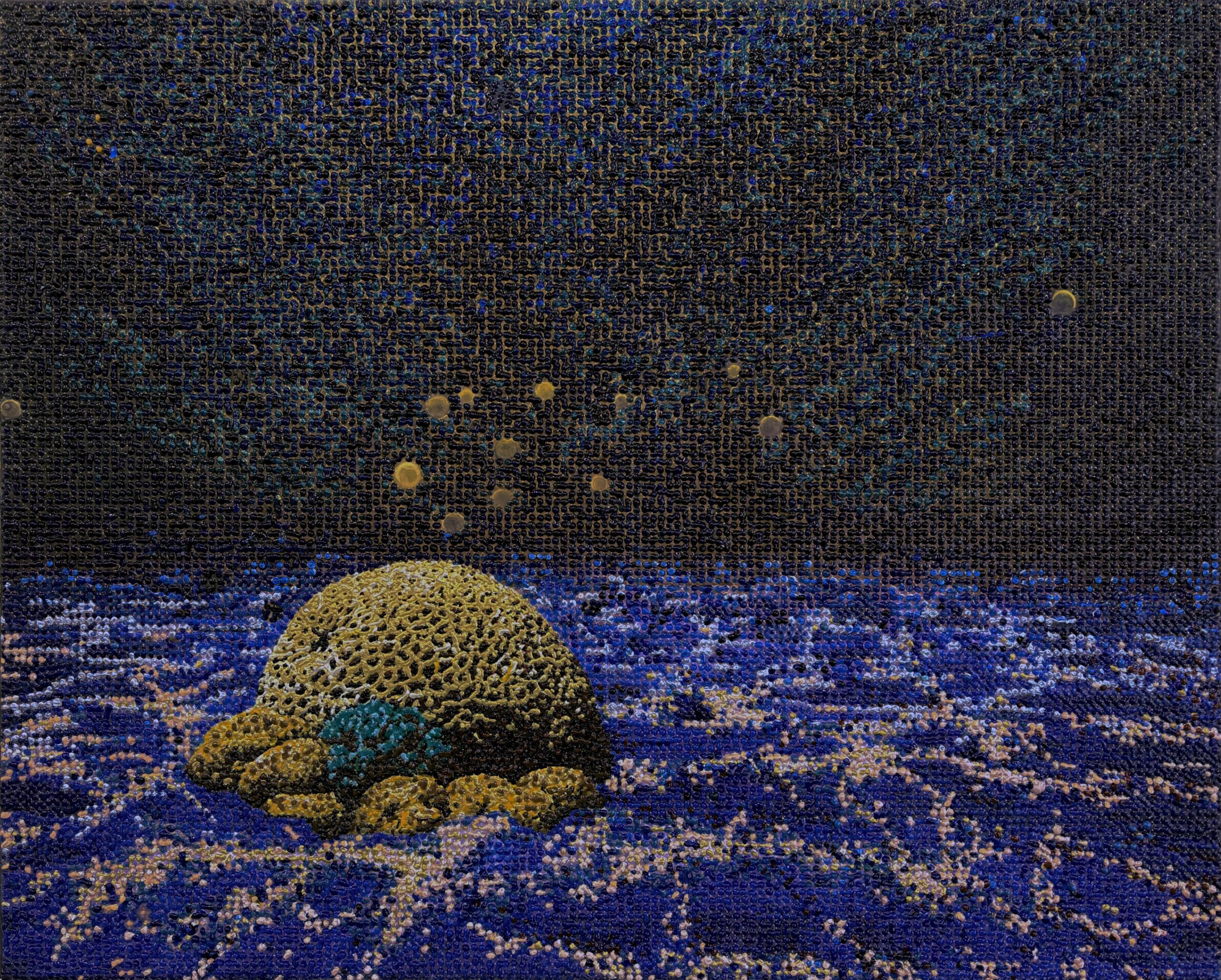 During the artist’s research on oil pollution on Kharg Island in the Persian Gulf—one of the most precious marine ecosystems in the region—the artist came across a species of coral known as dome-shaped coral. These corals are the beating heart of the marine ecosystem: they play a vital role in maintaining ecological balance, providing shelter for marine species, and regulating cycles of life. However, pollution caused by oil transportation, alongside industrial fishing, poses a serious threat to this ecosystem, and the death of these corals brings far-reaching consequences for the entire chain of life.