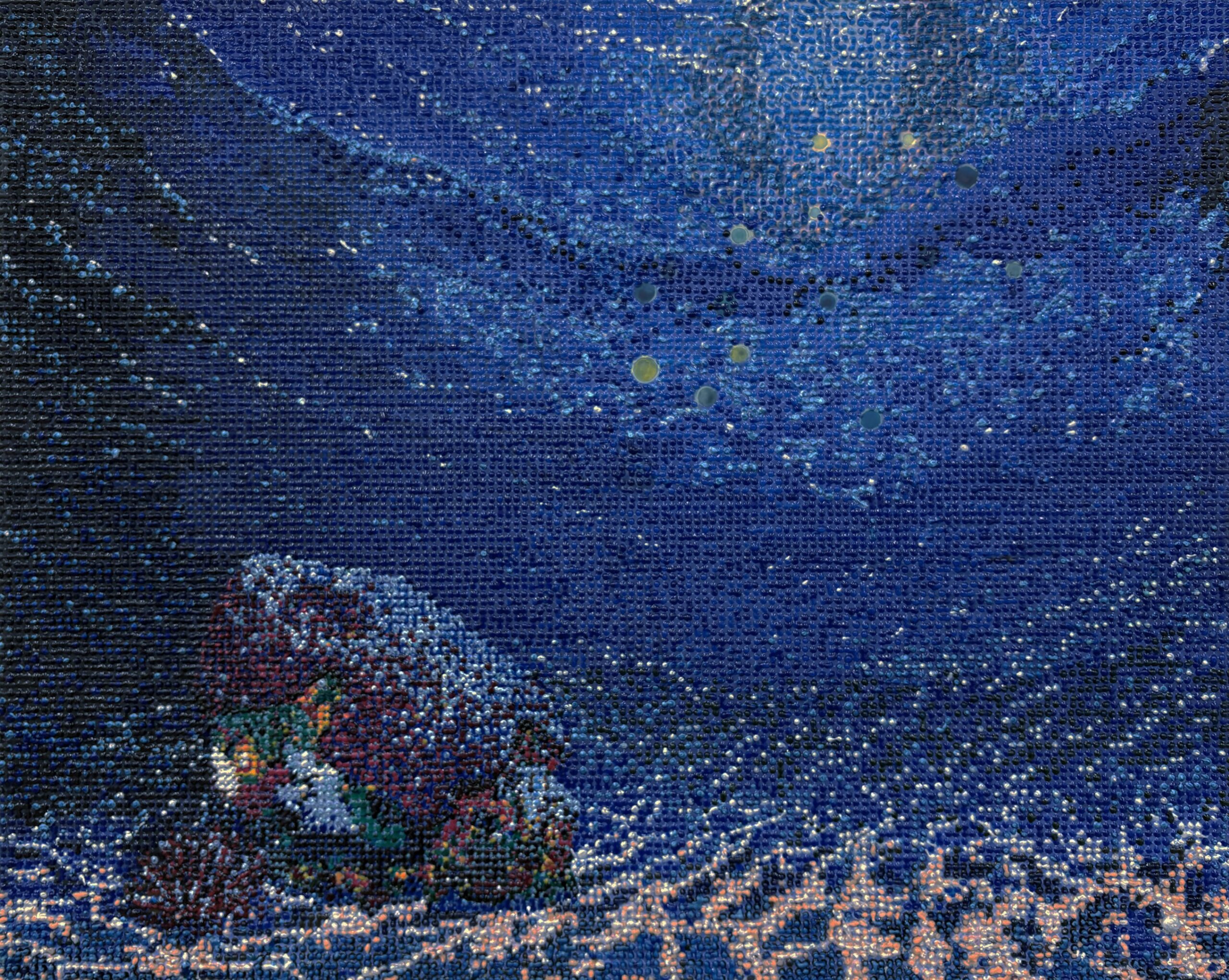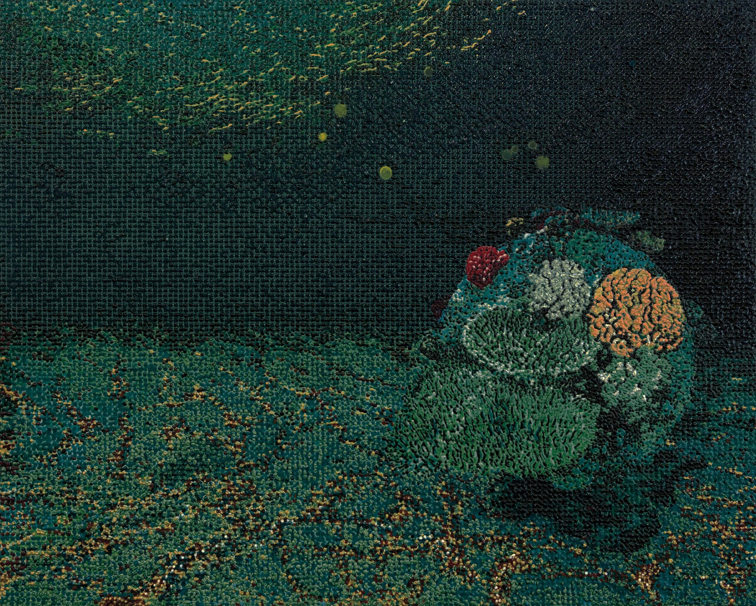This collection consists of seven paintings, each shaped under the influence of a coral dome and a color, with each color carrying a story. The title of each work is a distilled fragment of its narrative: “Black Coral Dome: Separation,” “Yellow Coral Dome: Truthfulness,” “Green Coral Dome: Pure Nature,” “Red Coral Dome: Love,” “Blue Coral Dome: Mirror,” “Sandal Coral Dome: Good and Evil,” and “White Coral Dome: Fulfilment.” Each painting depicts a coral dome—a solitary narrator, a remnant of an Eden-like garden in the depths of the sea, now transformed into a desert. Like the princesses in Nezami’s tale, each coral dome tells its own story and invites the viewer—like the king—to listen.